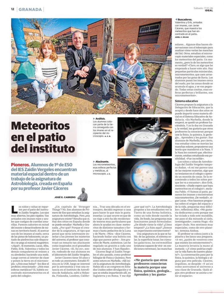 La materia de Astrobiología pionera en el Sistema Educativo español, se está impartiendo con éxito y buenos resultados en el interés de los estudiantes de 1 ESO por las Ciencias Aplicadas al estudio del espacio y el universo». Una de las actividades «Hands-mind ON» ha sido la búsqueda, recolección y estudio de las propiedades Físico-Químicas y cósmicas de los micrometeoritos.